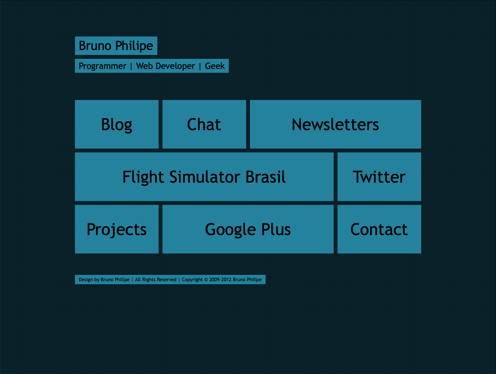 I've had a personal webpage online in some form since 2009. Like many people around then, it started as a Wordpress page (under a subdomain at first, then to brunophilipe.com) which eventually evolved into a self-hosted installation (I think, memory is hazy). The first version archived by Archive.org dates to 2012. I have to say I still like that web design a lot (and it was clearly inspired at least in part by Windows Metro – wow remember that?) It also includes links to Google Plus (wow, remember that??) and to a Flight Simulator fansite I created back then, which was actually my very first website. I also built other fanpages in Wordpress, since they were free and easy to create (some are still up, but I won't link them here.) The Flight Simulator fansite didn't last long, but my homepage did. I've held to that domain ever since, but have since migrated to bruno.ph (which I gleefully called the greatest domain hack of my life when registered, back at the peak age of domain hacks).